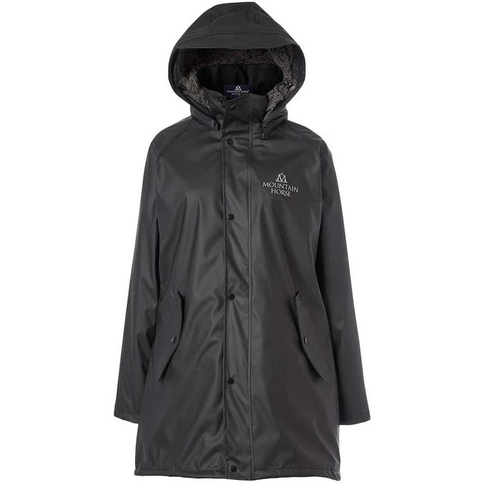 Fully waterproof rain coat with welded seams. Lined with cosy soft pile fabric. Large front pockets, Riding slit at back and reflective details.