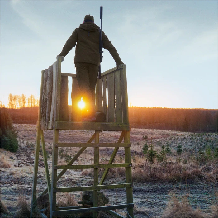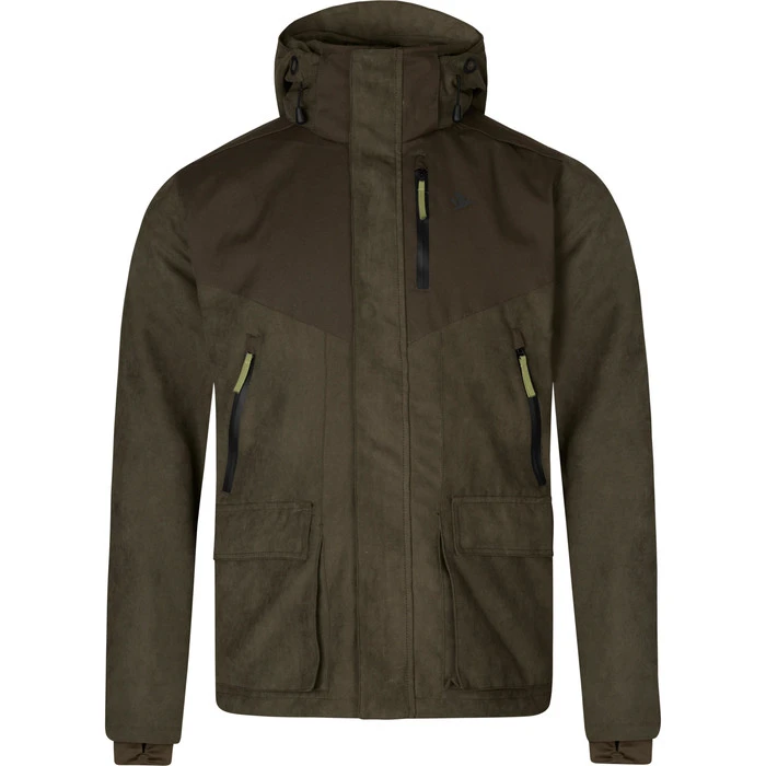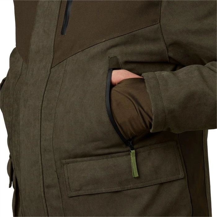 The Helt II jacket has a warm Thinsulate™ lining, to keep you snug, even as the temperature descends towards freezing. It also features our own waterproof, windproof and breathable SEETEX® membrane, with its hydrostatic head of 10,000 mm. In all, this is an excellent jacket for autumn and winter days, in cold and changeable weather, rain, sleet or snow. On the inside, there are a pair of straps sewn in, so you can remove the jacket and wear it like a rucksack. This is a practical solution, if, for example, you have a large kill to extract from the woods and risk overheating from the effort. Many hunters find this attention to detail invaluable. The jacket also incorporates a waterproof fold-out seat panel for comfort and protection when sitting on a wet high seat or similar. On the left chest is a zipped radio pocket with an antenna eyelet, and there are handwarmer pockets lined with soft, warm fleece, which are also zipped. There are two very large front pockets with silent magnetic closures and a large zipped game pocket at the back. The Helt II jacket’s removable hood is large enough to wear a beanie or cap underneath, and it has an elasticated drawstring for adjustment. The jacket has a high collar, lined with soft, warm fleece, and stretch fabric at the cuffs, with thumbholes, for a snug fit around the wrists. The main two-way zip is covered by a windproof flap with press studs, and there is a drawstring at the bottom hem to keep the warmth in and the cold out.