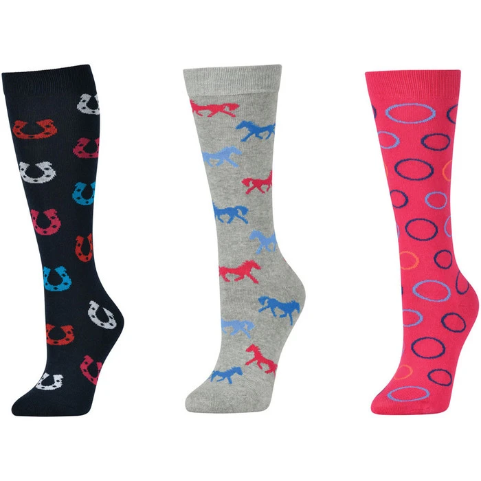 Complete your Equine wardrobe with this multi-pack of knee-length Dublin Socks. Manufactured from a stretchy fabric that is naturally breathable, the socks facilitate maximum aeration when out riding, whilst the various colourful designs are certain to make these versatile socks a firm favourite all year round. Perfect for your riding boots, the long sock doesn’t buckle and slide down your boot and the super fine control area on the calf provides extra comfort.