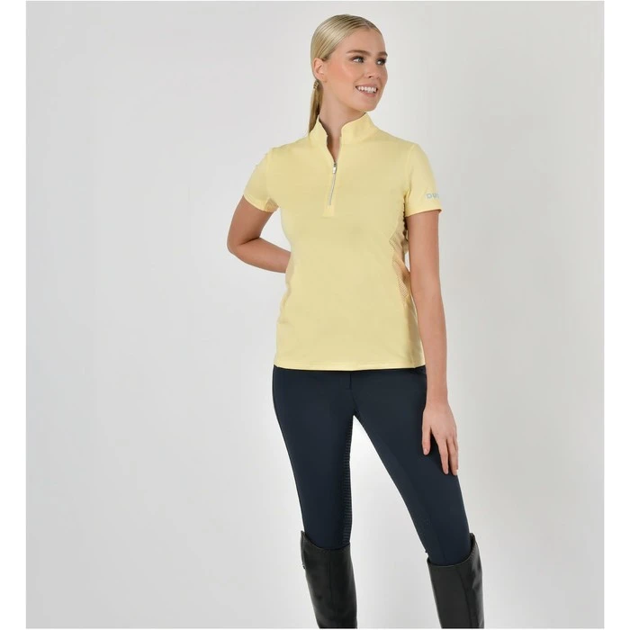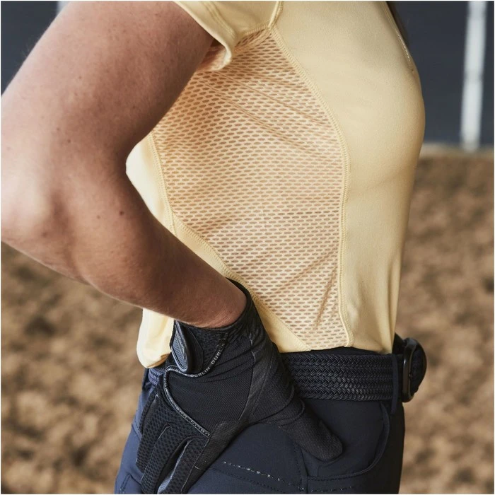 A great breathable short sleeved versatile top made from bi-stretch jersey fabric with sun protection factor 50+ and a peached outer. Featuring Comfort Dry Technology that will perform for you no matter what the weather providing moisture control for all day comfort. Mesh side panels, under sleeves and back yoke. The peached outer works to shed dirt, hay and horse hair, to keep you looking smart. A stand up collar with half zip placket, in a semi fitted style to offer a comfortable fit.