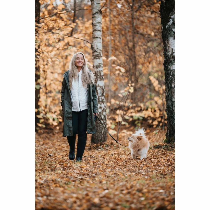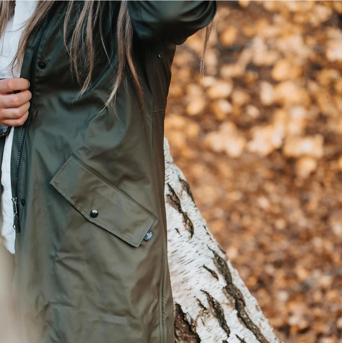 Waterproof long rain coat with welded seams. Two large front pockets, riding slit at back and reflective details.