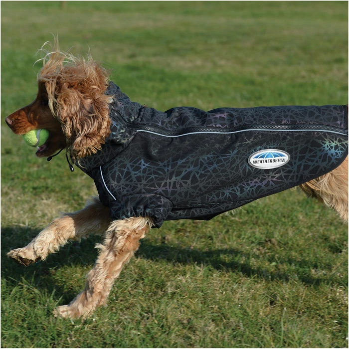 The WeatherBeeta ComFiTec Reflective Print Active Dog Coat is ideal for walks in cooler to milder weather, with a soft shell outer fabric that’s bonded with fleece to keep your dog warm and cosy. The dog coat is both showerproof and windproof to protect your dog from the elements. The zip along the back seam of the coat ensures a super snug fit, as well as covering your dog’s belly for extra warmth in cooler conditions, and is lined to protect your dog’s coat. The high neck design with elastic draw string ensures great fit and extra protection, with reflective piping for safety at night and lined lugholes with elastic to provide optimum freedom of movement. Leash hole for convenience.
