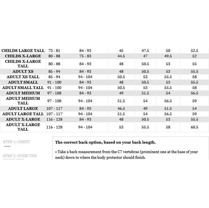 • Take a back measurement from the C7 vertebrae (prominent one at the base of your neck) down to where the body protector should finish.