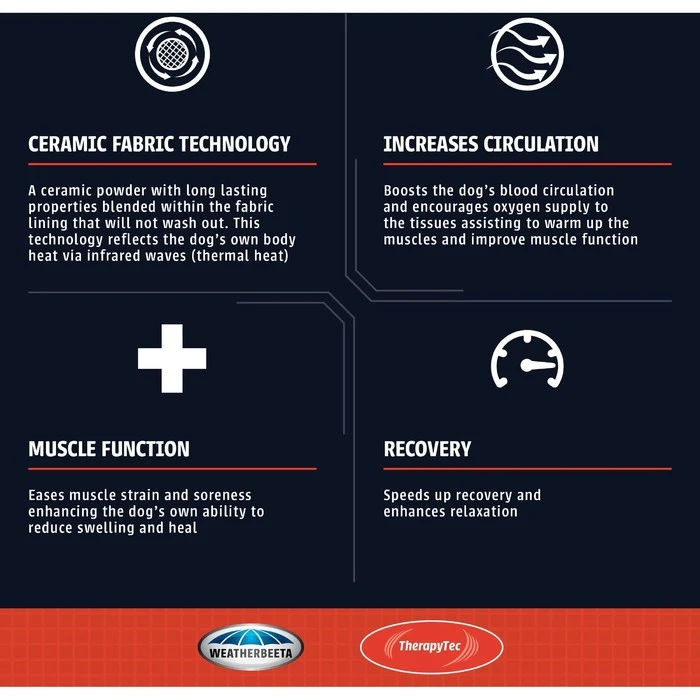 The WeatherBeeta Therapy-Tec Fleece Dog Coat is designed to boost blood circulation and ease muscle strain and soreness, speed recovery and enhance relaxation. The perfect choice for active dogs pre or post-exercise to warm up and down. It also works to reduce lactic acid build-up, plus assist with pain management and inflammation associated with arthritis or to simply keep your companion warm and comfortable. The warm breathable fleece outer fabric wicks away moisture and is a great choice for dogs who prefer a lightweight warmth option. Touch tape closures on the chest and belly. If machine washing, wash only at a low-temperature max 30 degrees on a gentle cycle Line dry Do NOT tumble dry or dry clean do not use bleach.